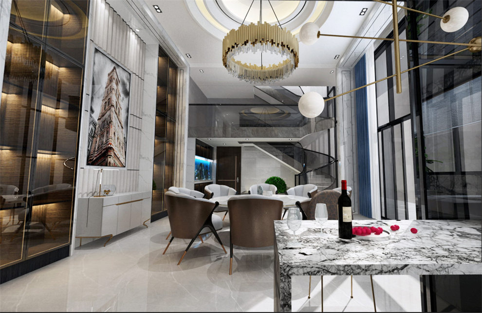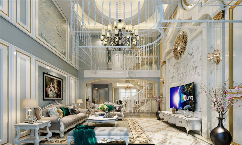 挑高客廳的頂部空間較為空曠,家具集中在下方,空間需要找回平衡感。大型吊燈能提供給挑高空間更多光線(xiàn),同時(shí)充盈上層空間。