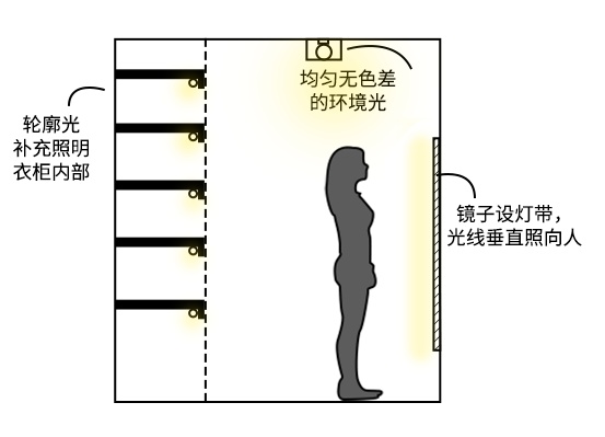 6、衣帽間在臥室中的話可以參考上圖的燈光布置,除了頂部需要設(shè)計(jì)明燈以外,衣柜內(nèi)部也建議設(shè)置感應(yīng)燈帶,并且盡量選擇接近日光等自然光的光源,避免燈光對(duì)人視覺效果產(chǎn)生干擾。